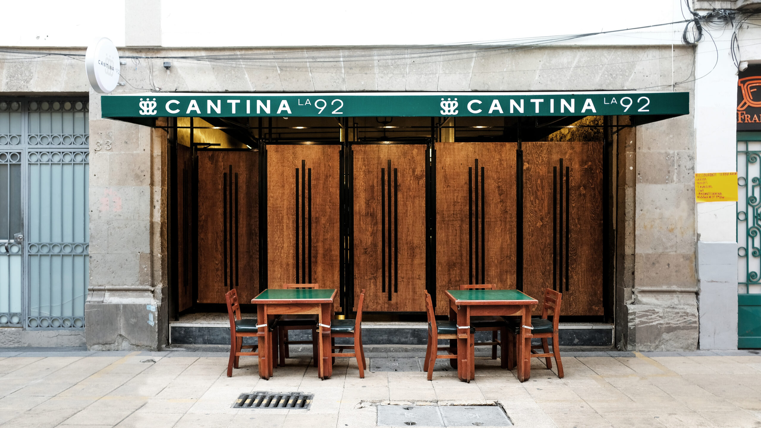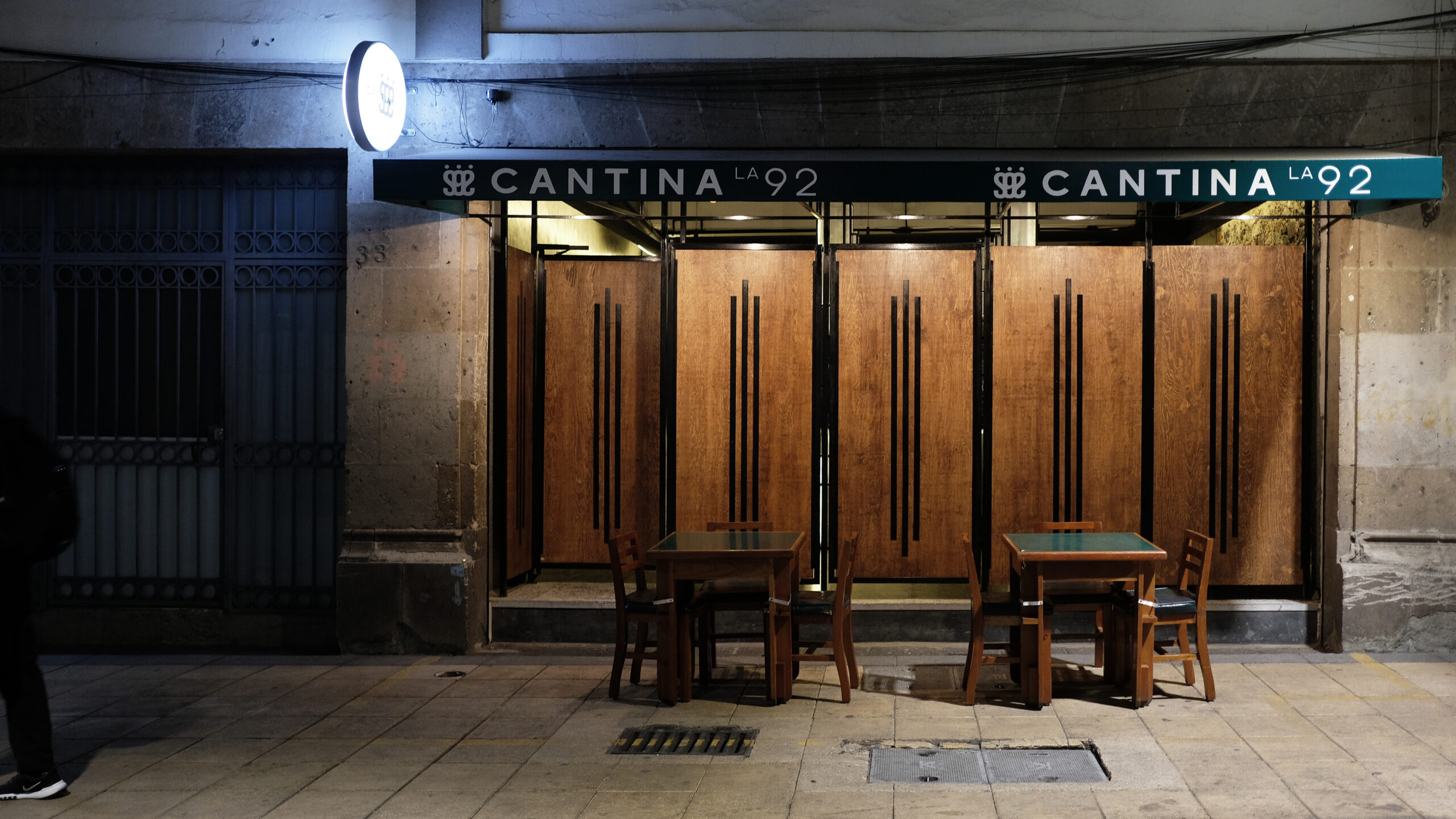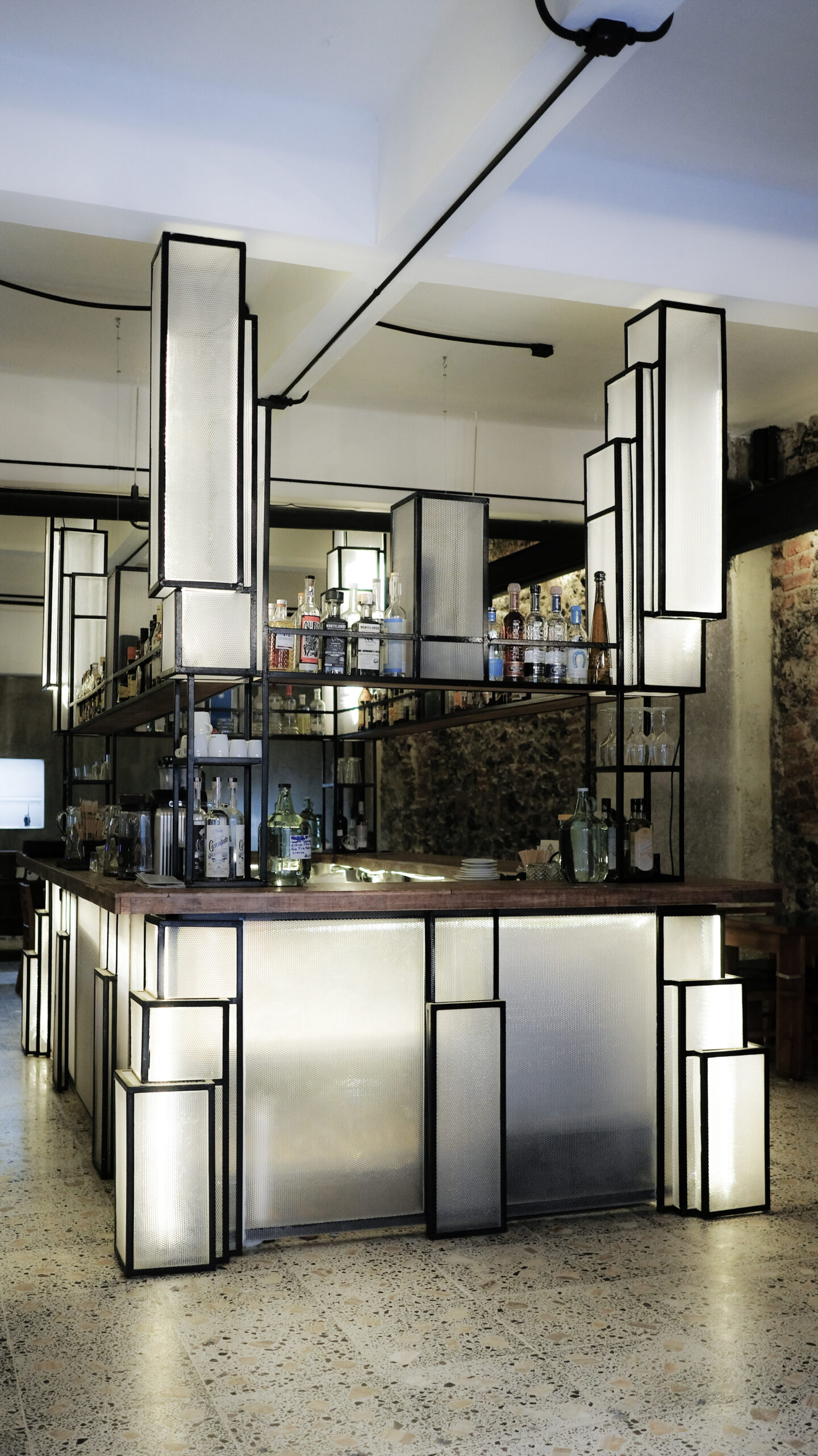 Desnudamos el espacio y fabricamos una barra escultórica que sirve como una gran lámpara que ilumina el salón, generando un ambiente tranquilo con luz tenue, al ser un edificio histórico solo limpiamos los muros y revelamos su materialidad aceptando su pasado.